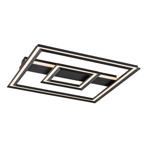 A modern stílusú Sidona mennyezeti lámpa jelentős fényerejével és vagány, szögletes formáival remek választás egy tágasabb nappaliba vagy hálószobába is. A fémből készült, fekete lámpa két eltérő nagyságú, négyzet alakú elemből áll, a lámpatestet fehér mű..