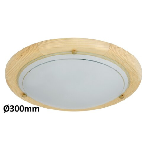Időtlen megjelenésű, fa, fém és üveg kombinációjú, mennyezeti lámpa, 1 darab E27-es foglalattal. 30 cm átmérőjű, natúr színű fa, fém lámpatest, fehér színű opálüvegbúrával. A lámpatest E27-es, max. 60W teljesítményű energiatakarékos fényforrással is haszn..