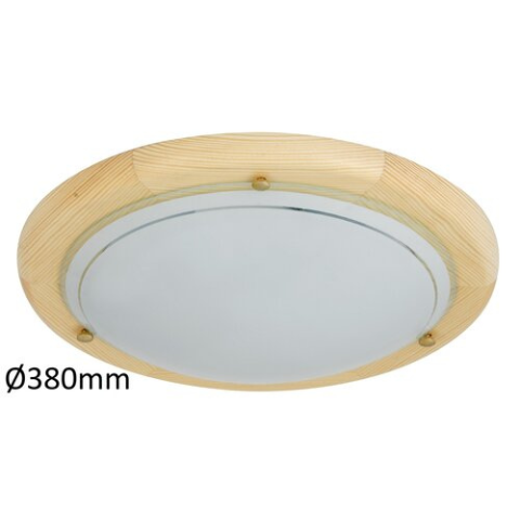 Időtlen megjelenésű, fa, fém és üveg kombinációjú, mennyezeti lámpa, 2 darab E27-es foglalattal. 38 cm átmérőjű, natúr színű fa, fém lámpatest, fehér színű opálüvegbúrával. A lámpatest E27-es, max. 60W teljesítményű energiatakarékos fényforrásokkal is has..