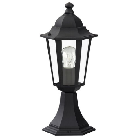Klasszikus megjelenésű kültéri állólámpa 1 db foglalattal. 40 cm magas, 21 cm átmérőjű, fekete színű fém lámpatest és víztiszta üvegbetétes lámpabúra, IP43-as védettséggel. A lámpatest E-27-es foglalatú, max. 60W teljesítményű energiatakarékos fényforráss..