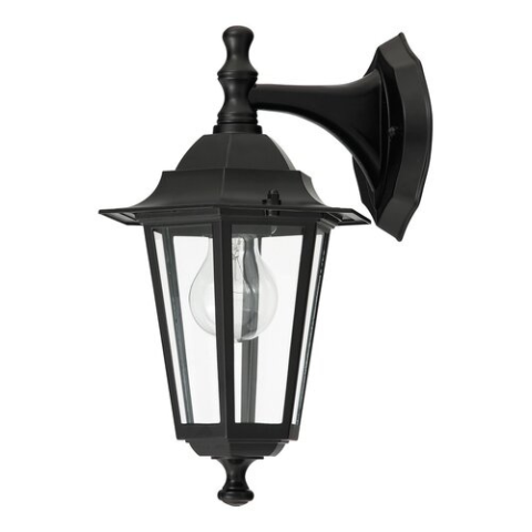 Klasszikus megjelenésű kültéri falikar 1 db foglalattal, alsó állású kivitelben. 35 cm magas, 23 cm kinyúlású, fekete színű fém lámpatest és víztiszta üvegbetétes lámpabúra, IP43-as védettséggel. A lámpatest E-27-es foglalatú, max. 60W teljesítményű energ..