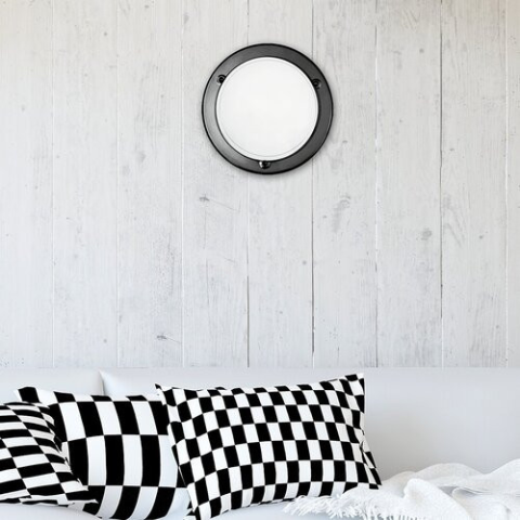 Időtlen megjelenésű, fém és üveg kombinációjú mennyezeti lámpa, 1 darab E27-es foglalattal. 28.5 cm átmérőjű, fekete színű fém lámpatest, fehér színű opálüvegbúrával. A lámpatest E27-es, max. 60W teljesítményű energiatakarékos fényforrással is használható