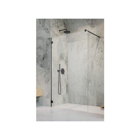 Essenza Pro Black Walk-in fekete zuhanyfal 145 átlátszó Modern, légies dizájnú walk-in zuhanyfal 145 cm szélességgel. 6 mm-es edzett üveggel és Easy Clean bevonattal készült, amely megakadályozza a vízkőfoltokat és lerakódásokat. A termékről Az Essen