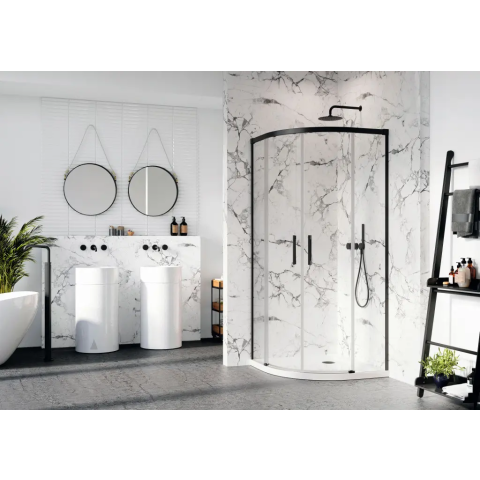Idea Black PDD íves fekete zuhanykabin 90x100 átlátszó Elegáns íves zuhanykabin 90x100 cm méretben, 6 mm vastag Easy Clean üveggel. Tolóajtós rendszer, alsó keret nélküli design és innovatív ajtófékezés garantálja a modern kényelmet és könnyű karbantartá