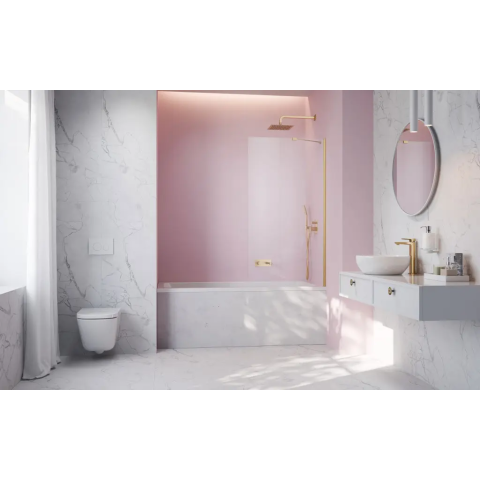Idea Brushed Gold PNJ II szálcsiszolt arany kádparaván 90 átlátszó Elegáns kádparaván 90 cm szélességgel és 150 cm magassággal, amelyet 6 mm vastag edzett üveggel és szálcsiszolt arany profilokkal gyártottak. Az Easy Clean vízlepergető bevonat megvédi a