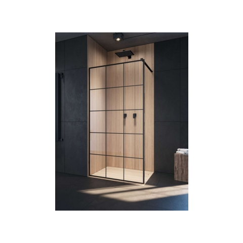 Modo X Black II Factory Walk-in fekete zuhanyfal 95 átlátszó Minimalista design és panorámaszerű kilátás a fürdőszobára. Ez a walk-in zuhanyfal 95 cm szélességgel tágasabbá teszi a fürdőszobát, 10 mm vastag edzett üveggel és egyedi Factory díszítéssel ké
