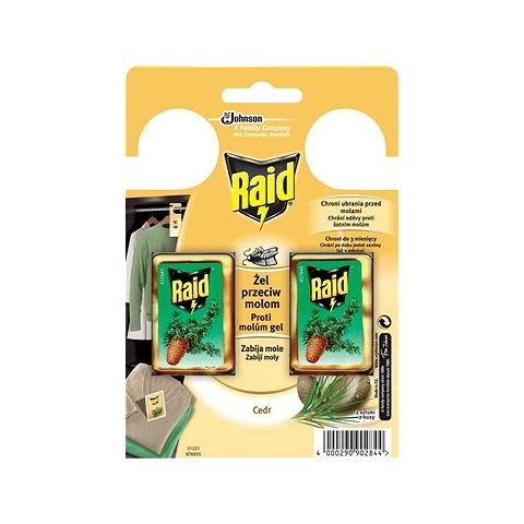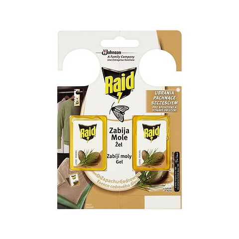 Rovarcsapda - illatosított kivitel, rovarölő szerrel, szekrénymolyok ellen, beltéri használatra , felfüggeszthető, elhelyezhető a kártevő előfordulása szerint, 2 darab a csomagban Raid molyírtó zselé. Könnyen beakasztható a szekrénybe a ruhák közé. A molyírtózselé egy erős fogantyú alakú kartonra helyezték. A szekrény kellemes illatú lesz, a rovarokat pedig akár