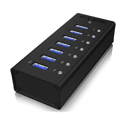 USB Hub - külső, leválasztható tápkábellel, csatlakozás USB 3.2 Gen 1 (3.0) segítségével, 7× USB–A 3.2 Gen 1 (3.0), anyaga műanyag, fekete szín, méretei 2,6 × 4,6 × 11,3 cm (ma × szé × mé), tömege 122 g, csatlakozó kábel és adapter a csomagban Az alumínium házú USB hub a modern USB 3.0 szabványt támogatja, akár 5 Gbps átviteli sebességgel. Ideális megoldás mind az asztali gép, mind a notebook USB-csatlakozói számának bővítésé