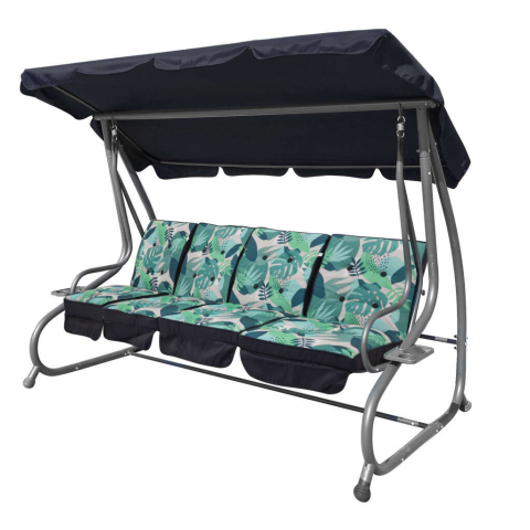 Kertre tervezett, árnyékolós hintaágy, 4 személyes, zöld levél mintával 🌿 Ez a nagyméretű, kényelmes kerti hintaágy tökéletes hely a pihenésre és kikapcsolódásra a szabadban. Élvezze a napsütést, vagy védje magát az árnyékban a beépített, állítható...