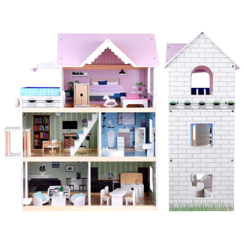 Háromszintes Fa Babaház LED Világítással és Bútorokkal - Álmok Háza 🏡✨ Ez a gyönyörű, nagy méretű, háromszintes fa babaház minden kislány álma valóra válhat! Gazdag felszereltsége, a működő lift és a tetőtéri medence garantálja a végtelen szórakozá...