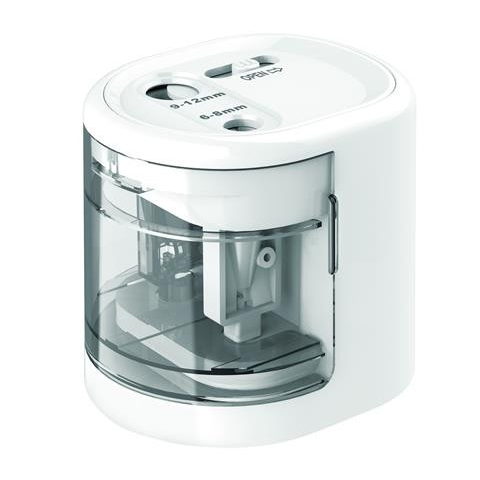 Stílusos automata hegyező -kétlyukú, elemes hegyezőgép -cserélhető acélpengék (IR1485) -normál (6-8 mm) és vastag (9-12 mm), grafit- valamint színes ceruzák hegyezéséhez -működtetés USB kábellel (tartozék) vagy 4 x AA elemmel (nem tartozék) -az adapt