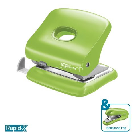 Lyukasztó, kétlyukú, 30 lap, RAPID FC30, élénk zöld - nagyteljesítményű, erős, fém lyukasztó megerősített ABS műanyagból készült karral és talppal - otthoni, iskolai és irodai használatra - könnyen üríthető, műanyag tartály - színében illeszkedik a VIV