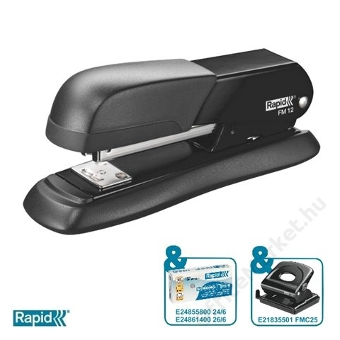 Tűzőgép, 24/6, 26/6, 25 lap, RAPID FM12, fekete (E5000273) - erős, fém féltáras tűzőgép gumi elemekkel a talpon és a felső részen - ergonómikus és precíz kialakítás - ideális otthoni és irodai használatra - kapacitás: 25 lap (80 g-os) - tűzési mélység:
