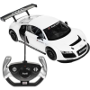 Távirányítású Audi R8 a sportautók szerelmeseinek! Az autómárka egyik legkedveltebb modelljének valósághű, részletgazdag másolata fehér színben. A távirányítóval jobbra, balra, előre és hátra kormányozható az autó, a kontroller működési frekvenciája 27 MHz. Az akkumulátor üzemideje hosszú, a távirányító hatótávja 30 méter. Az autó méretaránya 1:24, motorja elektromos. Egyaránt jó választás játékhoz és a gyűjteménybe. A termék üzemkész állap