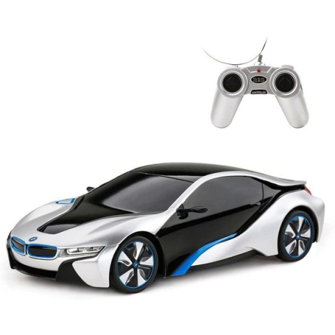 Távirányítós BMW i8 a sportautók és a száguldás szerelmeseinek!Az autómárka csúcskategóriás modelljének valósághű, részletgazdag másolata ezüst színben. A távirányítóval jobbra, balra, előre és hátra kormányozható az autó, a kontroller működési frekvenciája 27 MHz vagy opcionálisan 40 MHz. Az akkumulátor üzemideje hosszú, a távirányító hatótávja 30 méter. Az autó méretaránya 1:24, motorja elektromos. Sebessége maximum 9 km/h.Egyaránt jó válasz