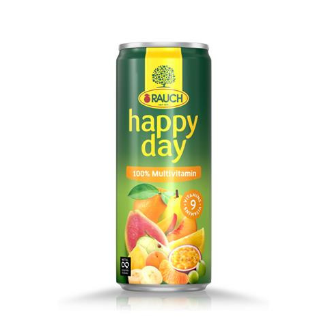 Happy Day 100%-os multivitamin. A Happy Day a gyümölcsök teljes skáláját kínálja, kezdve a klasszikusoktól, - mint a narancs és az alma -, egészen a különleges és egzotikus gyümölcsökig, mint az eper, a rebarbara, a mangó, a gránátalma és a pink guava. A