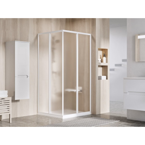 Zuhanysarok tálca nélkül fehér színben, a felület átlátszatlan üvegből készült Grape dekorral. A RAVAK AntiCalc® technológiának köszönhetően az üveg víztaszító tulajdonságokkal rendelkezik, ami azt jelenti, hogy az üveg felülete víztaszítóvá válik. Tolóajtó rendszer. bal és jobb oldali tájolás is.