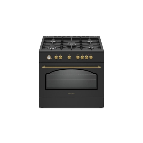 Design:Adjustable feet: YesProduct colour: BlackControl type: RotaryTimer: Y Product type: Freestanding cookerHandle colour: GoldenOven door material: GlassGas backflow protection: YesBurner lighter: In the knobGrate type: Cast ironHeat-resistant knobs: YesPower:Energy efficiency scale: A++ to DEnergy efficiency class (old): AWeight & dimensions:Weight: 65 kgDepth: 630 mmHeight: 885 mmWidth: 900 mmPackaging data:Package height: 875 mmPackage tare weight: 67,5 kgPackage depth: 660 mmPackage wid