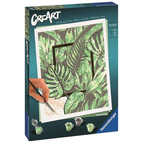 Festés számok szerint - téma virágok és növények, ecsetkészlet, festékek, kifestett minta és színpaletta a csomag része, méretek 30 × 24 cm (Ma×Sz) A szuper Ravensburger 202720 CreArt Légy boldog: Zöld levelek festés számok szerint kifestő fontosabb tulajdonságai Az élvezetes festés számok szerint előhozza az emberek kreatív vénáját Karton a vász