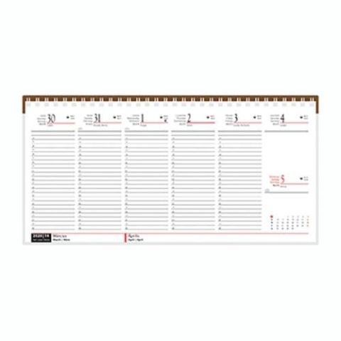 Ikerspirállal összefűzött, fehér papíros, fekvő naptár, heti beosztással (félórás), színes műbőrrel borított tartóval. Reklám felület: 320x50mm Egyediesítés: vakdombor, présfólia, 200db fölött 4c nyomott tartó.