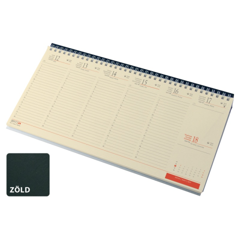 Asztali naptár kép nélküli REALSYSTEM fekvő sárga lapos zöld 2026. Ikerspirállal összefűzött, chamoir papíros, fekvő naptár, heti beosztással (félórás), színes műbőrrel borított tartóval. Reklám felület: 320x50mm Egyediesítés: vakdombor, présfólia,