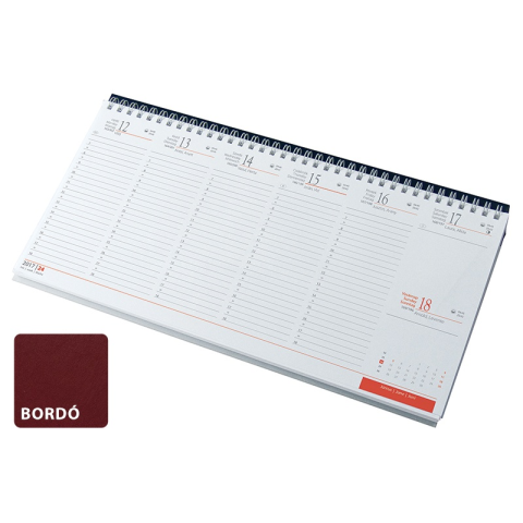 Asztali naptár kép nélküli REALSYSTEM fekvő fehér lapos bordó 2026. Ikerspirállal összefűzött, fehér papíros, fekvő naptár, heti beosztással (félórás), színes műbőrrel borított tartóval. Reklám felület: 320x50mm Egyediesítés: vakdombor, présfólia,