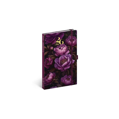 Határidőnapló REALSYSTEM 130x210 mm 2 hét oldalpáronként sárga lapos Purple flowers 2026. Keménytáblás kivitel, kétheti oldalpárokkal és jegyzetoldalakkal a végén. Leszorító gumizással, golyóstolltartóval és belső papír tároló zsebbel.