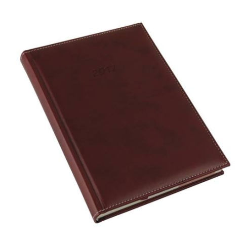 Hőre színeződő matt, varrott műbőr, borítással, présfólia és vaknyomással emblémázható. Sárga papíros, cérnafűzött, A/5 napi beosztású, 352 oldalas, sarokperforált, jelzőszalagot és térképet tartalmaz.