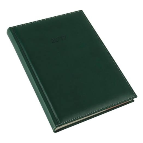 Hőre színeződő matt, varrott műbőr borítással, présfólia és vaknyomással emblémázható. Sárga papíros, cérnafűzött, B/5 heti beosztású, 144 oldalas, sarokperforált, jelzőszalagot és térképet tartalmaz.