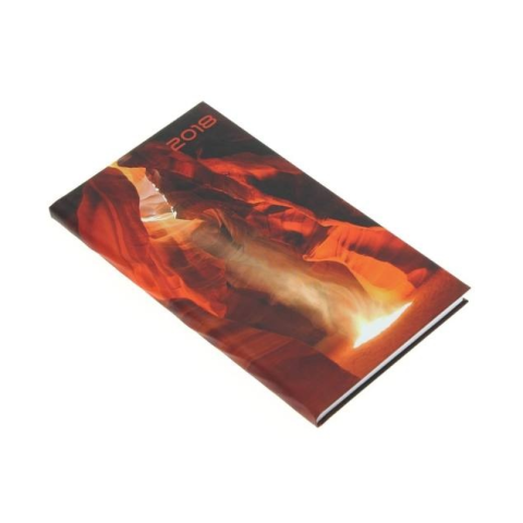 Különböző felületnemesítéssel, illetve fóliával bevont papírborító. Fehér papíros, cérnafűzött, heti beosztású zsebnaptár, 144 oldalas, sarokperforált.