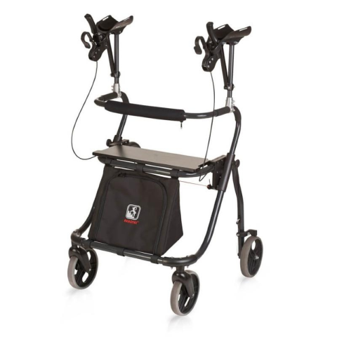 Nagy súlyú személyeknek revezett rollátor, bevásárlótáskával. Szinterezett acél vázzal, tömör gumi kerekekkel, magassága 10 fokozatban állítható. Összecsukható. Kétfunkciós fék 150 kg testsúlyig