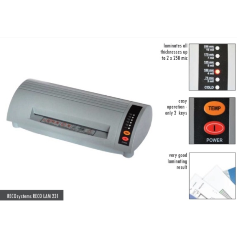 Reco Lam 231 laminálógép A4 max. 250 mikron Reco Lam 231 laminálógép A4 max. 250 mikron - munkaszélesség: A4, 230 mm - fólia vastagság: 75 - 250 mikron - max. anyagvastagság: 1 mm - laminálási sebesség: A4 kb. 45 másodperc - felfűtési idő: 3 per