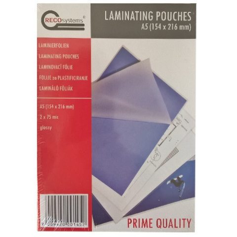 Lamináló fólia Recosystem 216x154 mm A/5 75 mic. 100 lap/csomag A5-ös 75 micronos lamináló fóliaCsomagolás: 100 lap/csomag