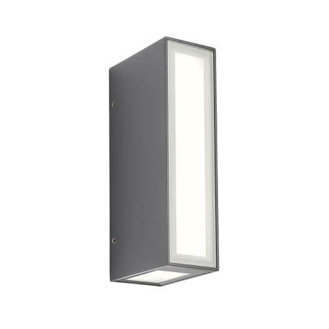 Matt sötétszürke színre festett alumínium vázas kültéri fali lámpa hőálló, üveg búrával. A lámpa beépített LED forrással és IP54-es védelemmel rendelkezik. Szemben, illetve felfelé és lefelé is világít...