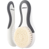 Fésű - kifésüléshez, gyerek hajra, műanyag nyél, kecskeszőr fogakkal, fehér és szürke kivitel A REER fésű és kefe készletet a finom babahaj fésülésére és formázására tervezték. A kefe puha természetes sörtékkel rendelkezik, amelyek nem karcolnak vagy húznak. A fésű alkalmas az erősen kusza haj