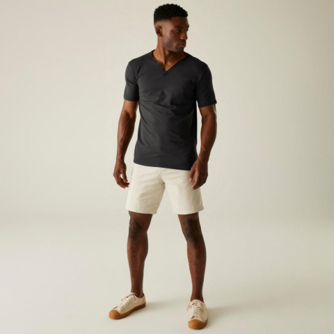 Férfi pamut póló Anyag: 160 g/m? single jersey ? 95% BCI pamut / 5% elasztán Tulajdonságok: V-nyakú kialakítás ? modern és elegáns megjelenés Grandad gombos gallér ? klasszikus és stílusos részlet Mosott kivitel a puhább tapintás érdekében ? extra kényele