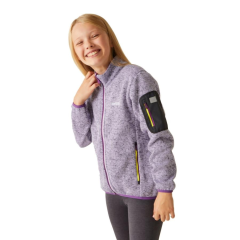 Gyerek polár felső Újrahasznosított 250 g/m2-es 100% poliészter márga kötött hatású polár 2 cipzáras alsó zseb és 1 cipzáras ujjzseb Stretch kötés a mandzsettákon és a szegélyen Regatta Junior Newhill Gyerek polár felsõ Lásd a terméken 8DM lila Gyerek