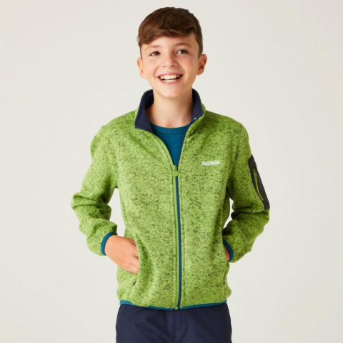 Gyerek polár felső Újrahasznosított 250 g/m2-es 100% poliészter márga kötött hatású polár 2 cipzáras alsó zseb és 1 cipzáras ujjzseb Stretch kötés a mandzsettákon és a szegélyen Regatta Junior Newhill Gyerek polár felsõ Lásd a terméken 1D3 zöld Gyerek