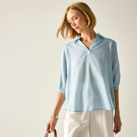 Női blúz Prémium női könnyû nyári blúz ? broderie és pamut-len kombináció, laza szabás Ez a női nyári blúz 100% pamut broderie anyagból készült, 120 g/m? súlyban, amelyet 90% pamut / 10% len fonalfestett csíkos, könnyû anyag egészít ki 90 g/m? kivitelben.