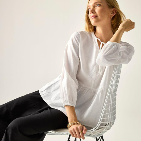 Női blúz Prémium női könnyû pamut-len blúz ? 90 g/m?, laza szabás Ez a női blúz 90% pamut / 10% len összetételû, rendkívül könnyû, 90 g/m? súlyú anyagból készült. A természetes szálösszetétel kiváló légáteresztést és kellemes, hûs érzetet biztosít meleg i