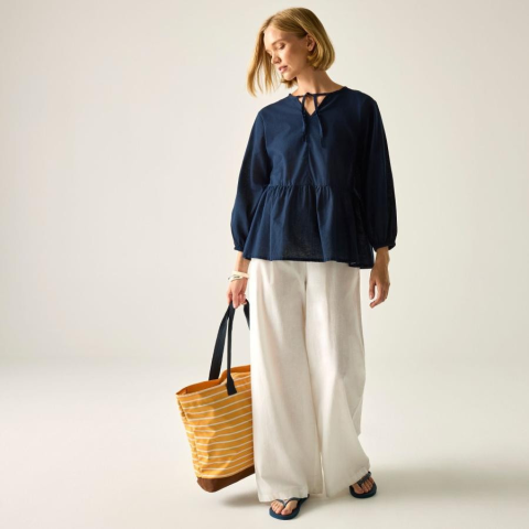 Női blúz Prémium női könnyû pamut-len blúz ? 90 g/m?, laza szabás Ez a női blúz 90% pamut / 10% len összetételû, rendkívül könnyû, 90 g/m? súlyú anyagból készült. A természetes szálösszetétel kiváló légáteresztést és kellemes, hûs érzetet biztosít meleg i