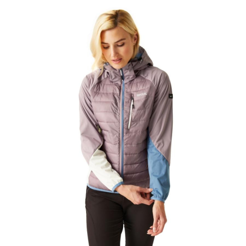 Női softshell hybrid felső Könnyû 100% poliészter Softshell XPT sztreccs anyag Víz- és szélálló membránanyag Könnyû, 100% poliamid ripstop anyag Tartós vízlepergető felület a testre Könnyen összenyomható Könnyû töltet Levehető kapucni 2 cipzáras alsó z