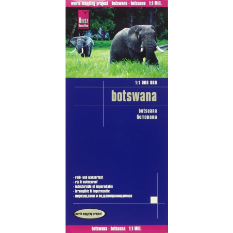 Botswana autós térkép, kétoldalas térkép 1 : 1 000 000 4 nyelvű jelmagyarázat: angol, francia, német, spanyol kis politikai áttekintő térkép Gaborone várostérképpel 2024-es kiadás. Vízálló térkép és szakadásálló.