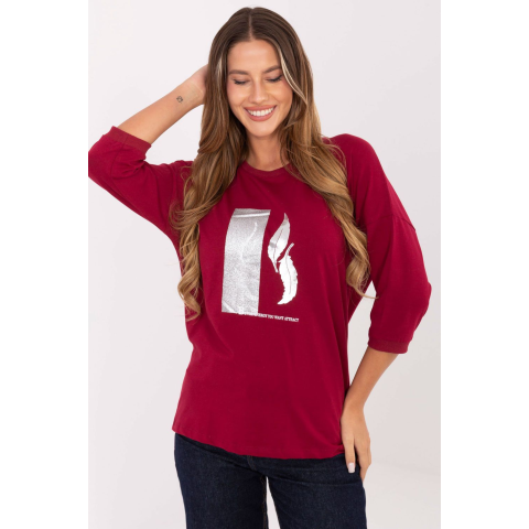 Női Blúz Relevance MM-218827. Színe: Piros A metalizált nyomattal díszített női laza felső tökéletes választás mindennapokra, amely finom csillogást ad a szettnek. A puha pamut anyag és az elasztán keveréke kényelmet és szabad mozgást biztosít, a szabványos hossz pedig könnyen kombinálhatóvé teszi a kedvenc nadrágokkal vagy szoknyával. A 3/4-es ujjú és klasszikus kerek nyakkivágással ellátott modell kényelmet és divatos st