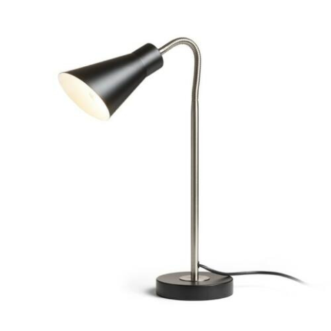 Fém asztali lámpa rugalmas nyakkal, E27-es izzóval való használatra.