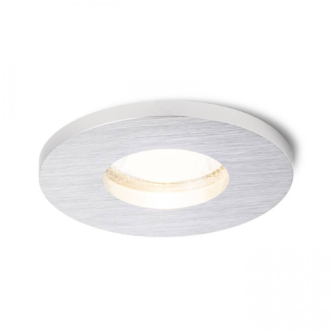 Süllyesztett lámpa szálcsiszolt alumínium kerettel. A fény nyílást részben szatinált üveg borítja. Párás környezetben használható.