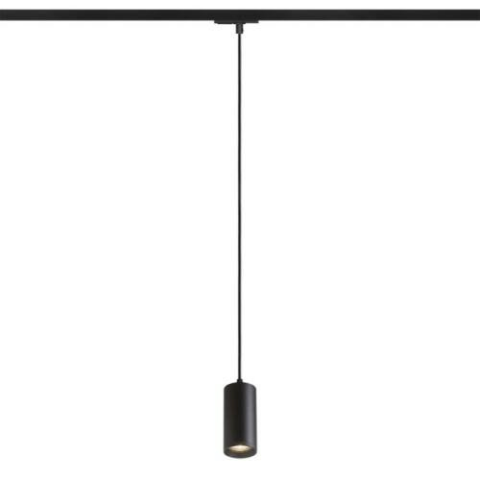 Egyszerű henger alakú függesztett lámpa GU10 foglalattal. A rugóval ellátott foglalat lehetővé teszi a különböző hosszúságú izzók használatát. A tápkábelt adapter zárja egyfázisú áramkörös sínbe.