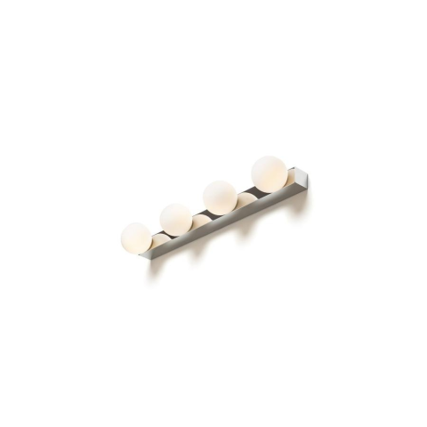 Fürdőszobai hosszúkás fali lámpa négy opálos árnyékolóval krómozott talapzaton. G9-es foglalattal rendelkező LED fényforrásokhoz alkalmas.