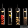 Függesztett lámpa átlátszó üvegbúrával és króm kiegészítőkkel. Az üvegernyő alul zárt, melybe dekorációkat lehet beilleszteni. A tápkábel egy háromkörös szalaghoz csatlakozó adapterrel van lezárva.