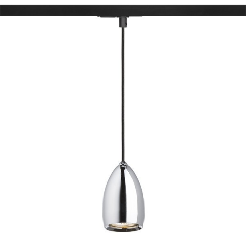Függő lámpatest króm vagy matt nikkel búrával. A fekete textil kábelt adapter zárja az egy áramkörű sínbe.